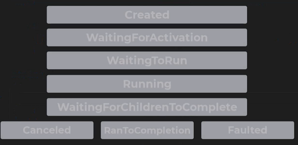 - RanToCompletion: If everything goes well, the task life cycle ends here.