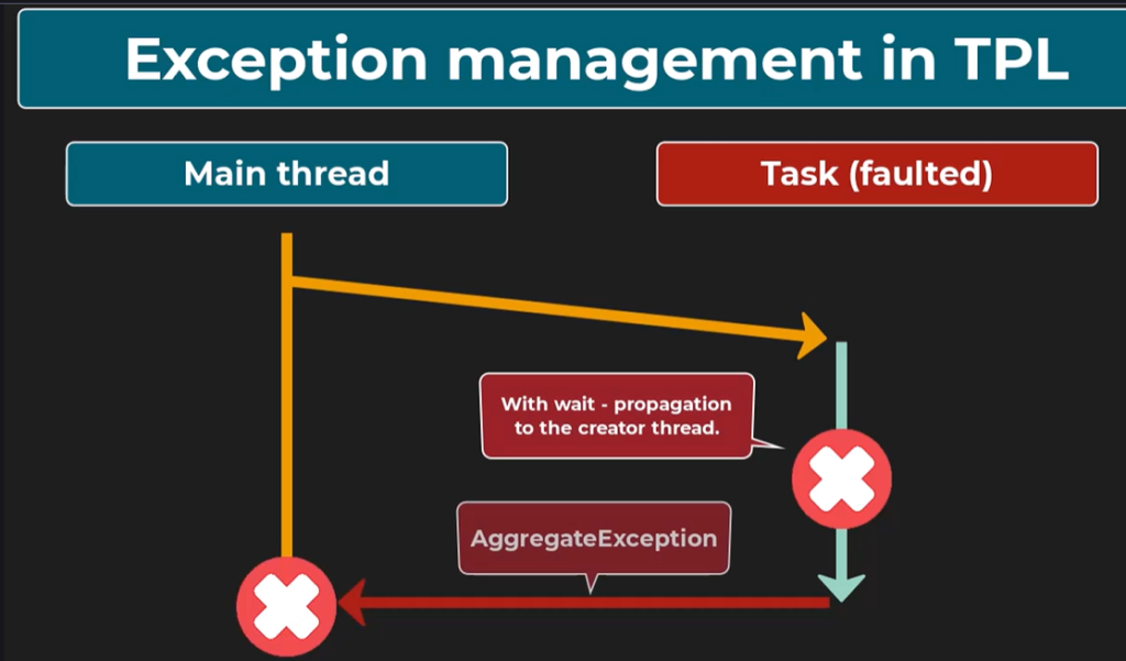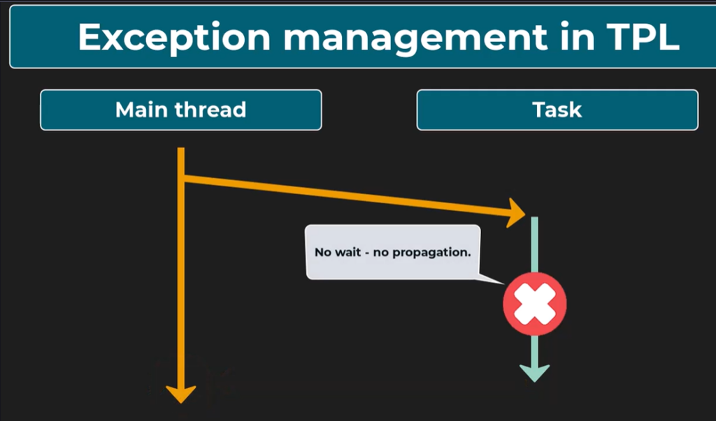If we don’t wait for the task completion, the exception will not reach the thread that started the task. We will only be able to see that it happend by checking if the task statks is Faulted, and that the Exception property carries exceptions.