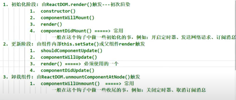 - componentWillUnmount: 做一些收尾工作,如:清理定时器